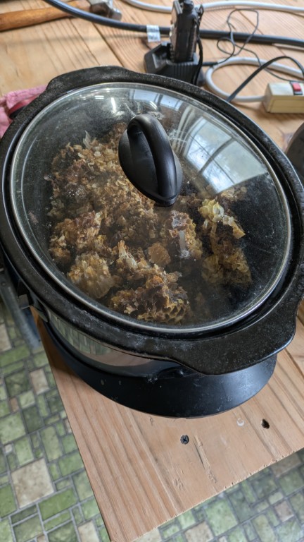 This spring, J had several requests for honey with the comb. So, this was something new and she made it happen. She is also harvesting a lot of the top cover comb to use in processing out pure beeswax. Beeswax is beautiful in its raw form.