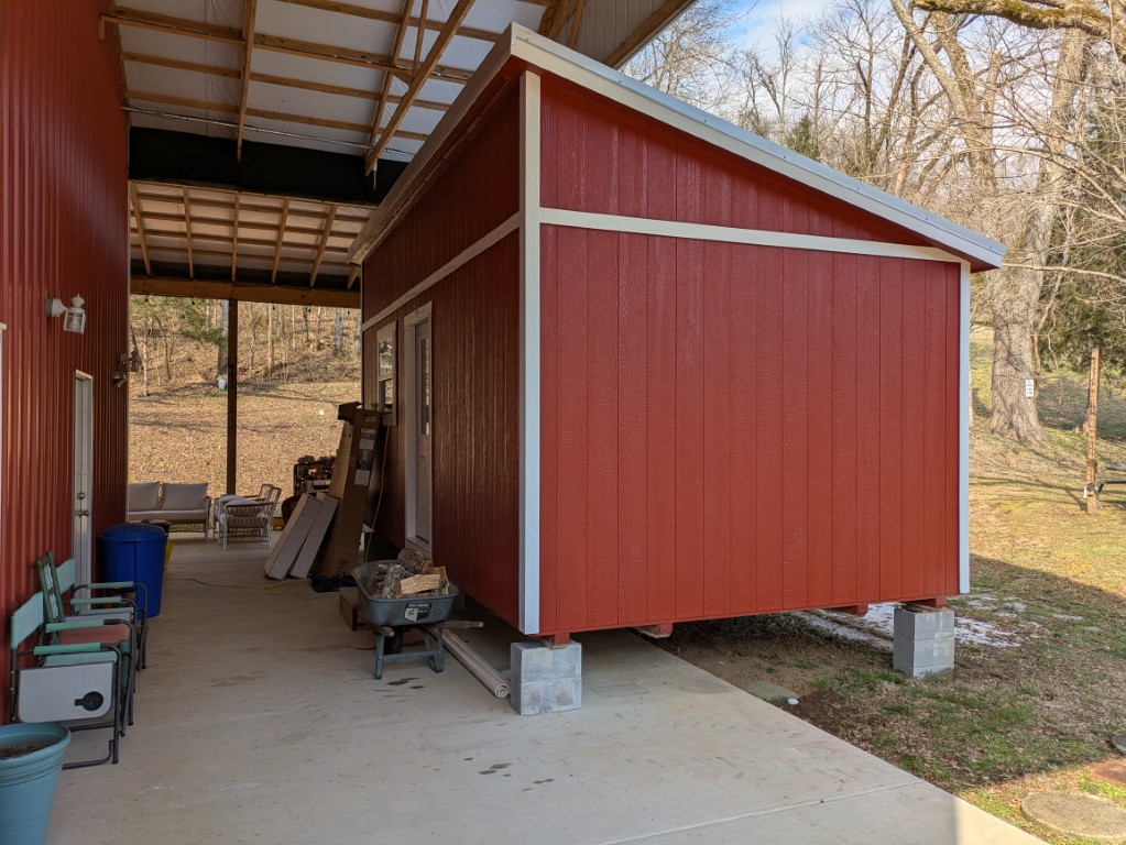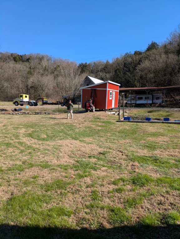 We started with designing a 12X20 FT single slope roof tiny home that would match in colors and style with other buildings. We took those plans over to Country Barn out of Belvidere,TN and got an estimate for its custom construction. We have already purchased one barn from them and knew the quaility of the work they did with the first. It was ordered on 11/12/25 and delivered on 12/15/2025.