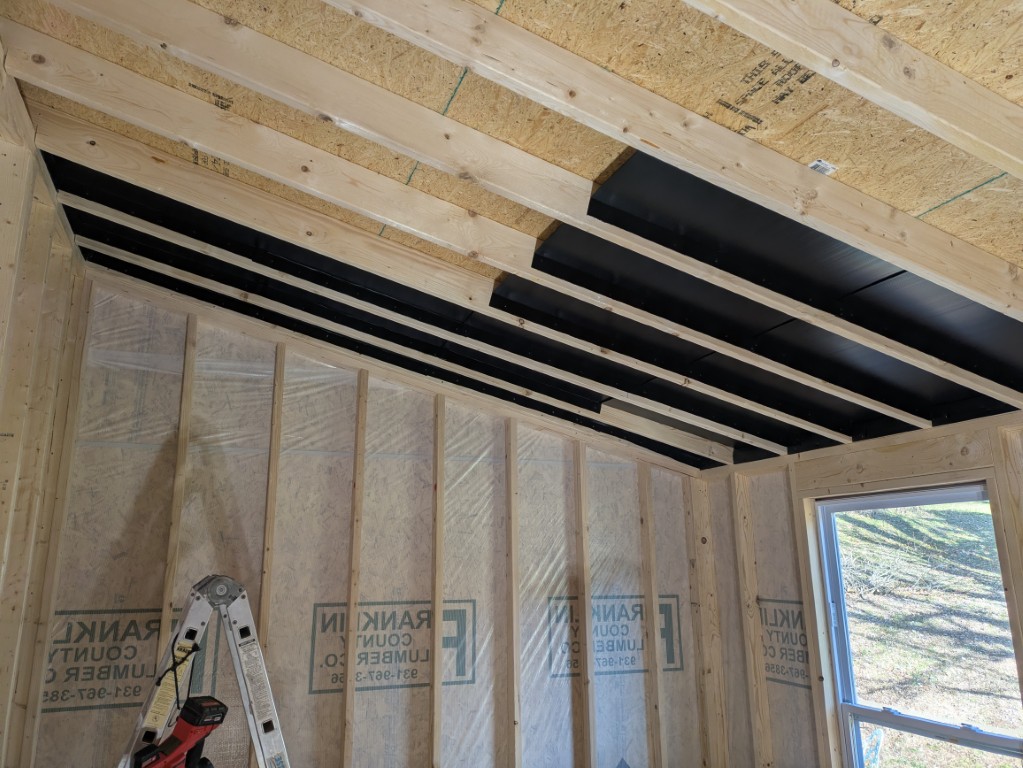 I tried something new out this time for the floor and ceiling Insulation design, "baffles". Under the flooring I placed 3.5" rockwool safe and sound insulation and then sealed it in place with baffles.This is a perfect fit for a 2X6 floor joist. I will still have to foam any holes/seams in putting it up.